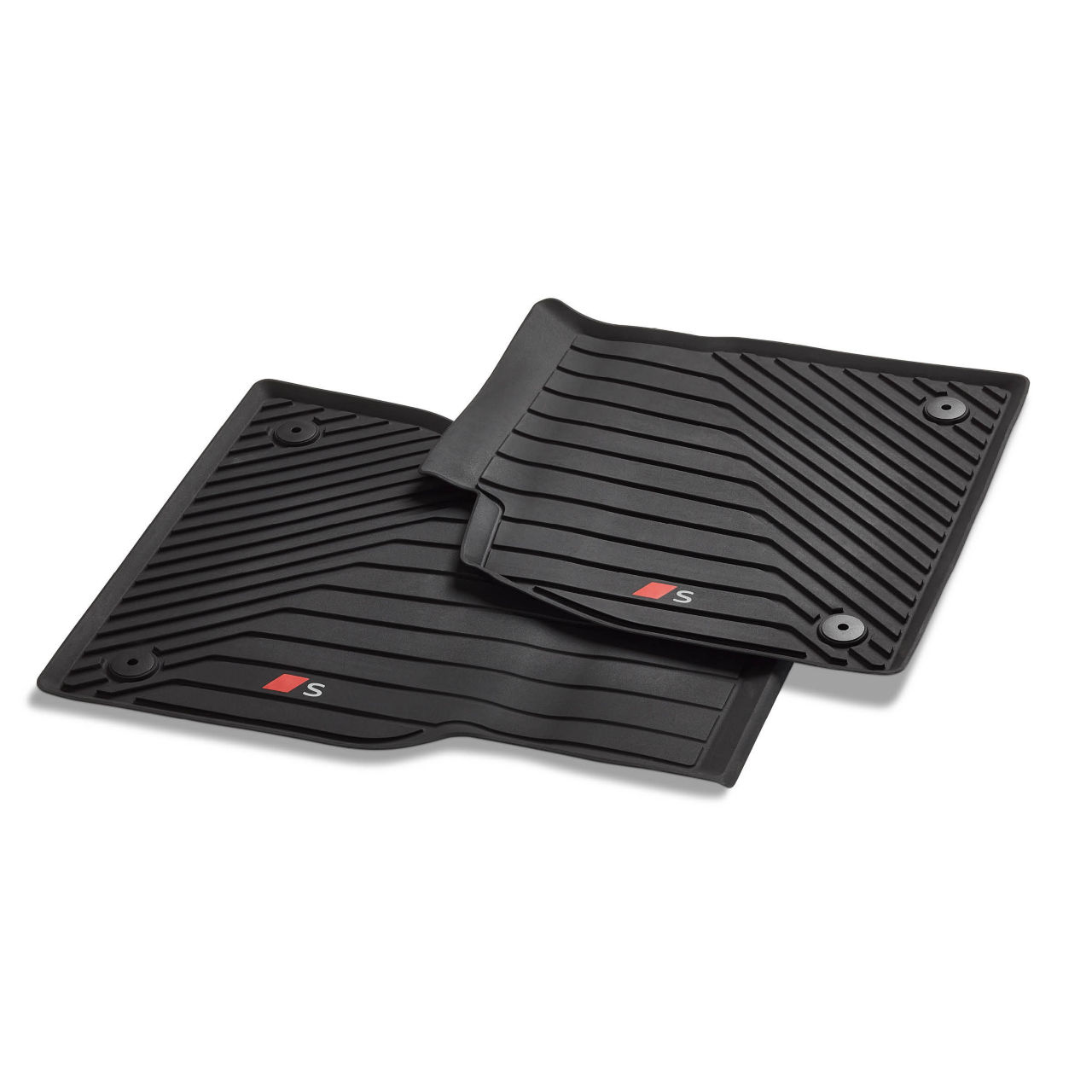 Dywaniki podłogowe na każdą pogodę są optymalnie dopasowane do kształtu podłogi Audi S6 e-tron. Mają one logo Audi S w kontrastowym kolorze. Dywaniki podłogowe na każdą pogodę są wykonane z wysokiej jakości tworzywa sztucznego zawierającego surowce z recyklingu, a tym samym przy odpowiedniej utylizacji mogą być poddane recyklingowi. Dzięki zamocowaniu w przewidzianych do tego celu punktach w strefie podłogi są one połączone z podłogą pojazdu. Dodatkowe wypustki na spodzie minimalizują ślizganie. Dywaniki podłogowe na każdą pogodę chronią wnętrze pojazdu przed wilgocią i większymi zanieczyszczeniami, są wytrzymałe i łatwe w czyszczeniu.