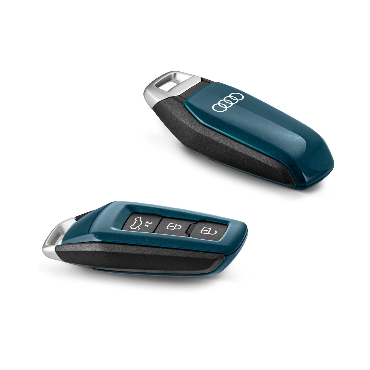Osłona na kluczyk wysokiej jakości w kolorze niebieskim Malpelo z pierścieniami Audi zapewnia możliwość ekskluzywnej personalizacji kluczyka pojazdu Osłona dekoracyjna montowana jest na oryginalnym kluczyku za pomocą umieszczonej wewnątrz folii samoprzylepnej.