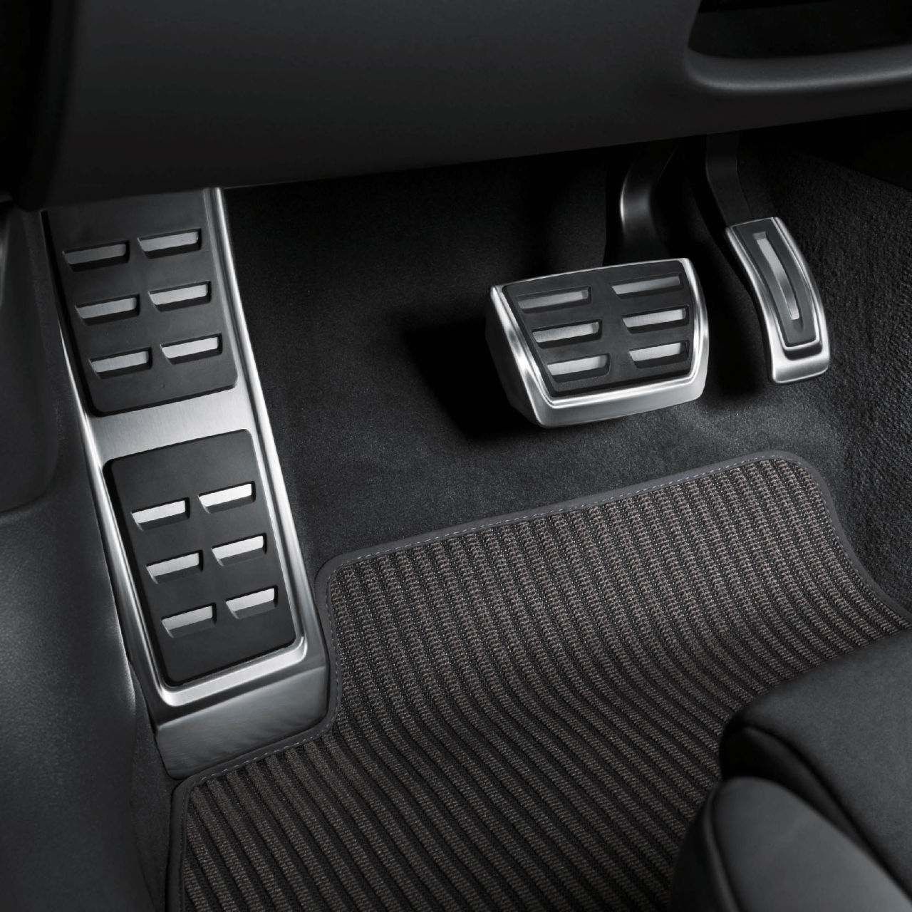 Nakładki na pedały ze stali nierdzewnej wysokiej z podstawką na stopę do samochodów z S tronic. Połączenie szczotkowanej stali nierdzewnej i antypoślizgowej gumy stanowi perfekcyjną mieszankę stylu i bezpieczeństwa.